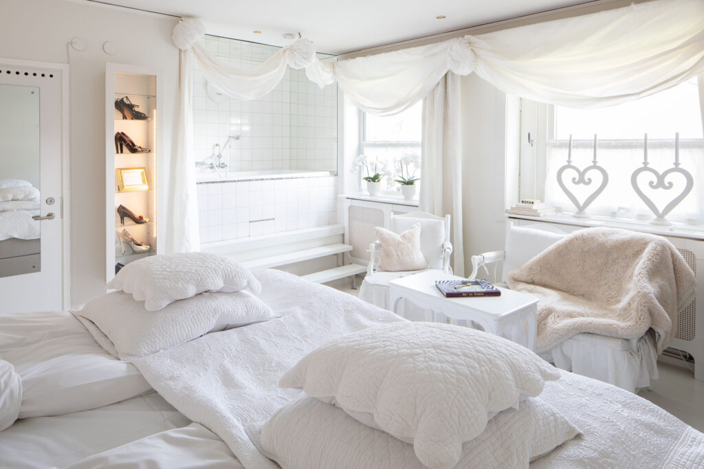 Nude – jag ville ha en vacker målning på en naken man som skulle vara smakfull och täcka hela sänggaveln. Då jag är begåvad med en mycket konstnärligt lagd svägerska hjälpte hon mig genast. Hon är inte längre gift med min bror men jag ser henne fortfarande som svägerska. Hennes nya man fick ställa upp på att bli målad för det här rummet. Den fina målningen som sitter i taket målades till Amelia Adamos 70-årsfest för några år sedan och satt då på väggen i Bomans Ballroom. Men vad passar väl bättre än att ha den vackra Basilika San Marco att öppna ögonen till på morgonen!