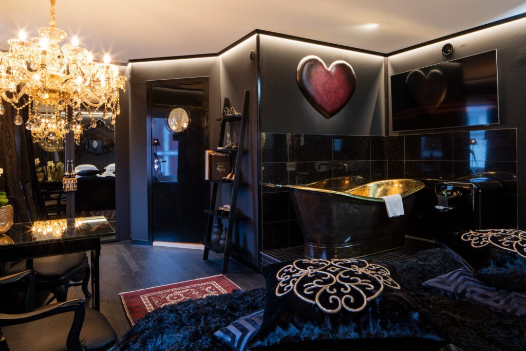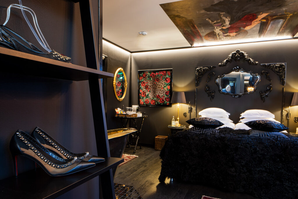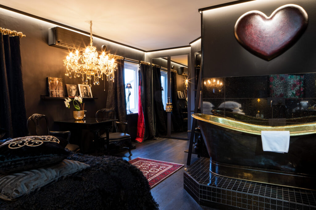 Invidia betyder avund! Här är det den vackra drottningen i Snövit som är inspirationen. Spegel spegel på väggen där… Min svägerska Karin har målat den elaka och strama drottningen ovanför sängen. Det stora hjärtat i rött skinn som sitter ovanför badkaret är formgivet av konstnären Oliver Skifs och symboliserar det saftiga röda äpplet i sagan. Det här är för er som verkligen gillar svart (precis som jag själv). Alla fantastiska tassels hittade jag i en liten butik på West Broadway i NYC. Ytterligare en plats för härliga inköp av tyger.